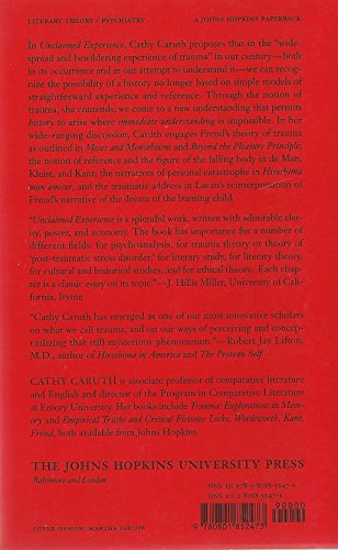 "'Unclaimed Experience' is a splendid work, written with admirable clarity, power, and economyThe book has importance for a number of different fields: for psychoanalysis, for trauma theory or theory of 'post-traumatic stress disorder,' for literary study, for literary theory for cultural and historical studies, and for ethical theory. Each chapter is a classic essay on its topic."--J. Hillis Miller, University of California, Irvine