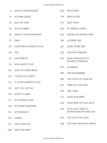 (Jazz Transcriptions). The ultimate collection for jazz keyboardists to learn 40 Evans classics with exact note-for-note transcriptions. Includes: Alice in Wonderland * Autumn Leaves * Bill's Hit Tune * Blue in Green * Days of Wine and Roses * Emily * Everything Happens to Me * Five * For Nenette * How About You? * How My Heart Sings * I Loves You, Porgy * It Could Happen to You * Just You, Just Me * Letter to Evan * My Foolish Heart * My Funny Valentine * My Romance * Nardis * Night and Day * One for Helen * Peace Piece * Peri's Scope * Quiet Now * Re: Person I Knew * Skating in Central Park * A Sleepin' Bee * Some Other Time * Stella by Starlight * Song from M*A*S*H (Suicide Is Painless) * 34 Skidoo * Time Remembered * The Touch of Your Lips * Turn Out the Stars * Very Early * Waltz for Debby * What Kind of Fool Am I? * Who Can I Turn to (When Nobody Needs Me) * You Go to My Head * You Must Believe in Spring * and more. Spiral bound.