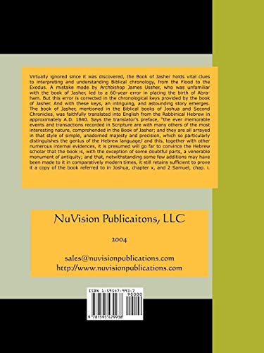 Virtually ignored since it was discovered, the Book of Jasher holds vital clues to interpreting and understanding Biblical chronology, from the Flood to the Exodus. A mistake made by Archbishop James Ussher, who was unfamiliar with the book of Jasher, led to a 60-year error in placing the birth of Abraham. But this error is corrected in the chronological keys provided by the book of Jasher. And with these keys, an intriguing, and astounding story emerges. The book of Jasher, mentioned in the Biblical books of Joshua and Second Chronicles, was faithfully translated into English from the Rabbinical Hebrew in approximately A.D. 1840. Says the translator's preface, the ever memorable events and transactions recorded in Scripture are with many others of the most interesting nature, comprehended in the Book of Jasher; and they are all arrayed in that style of simple, unadorned majesty and precision, which so particularly distinguishes the genius of the Hebrew language/ and this, together with other numerous internal evidences, it is presumed will go far to convince the Hebrew scholar that the book is, with the exception of some doubtful parts, a venerable monument of antiquity; and that, notwithstanding some few additions may have been made to it in comparatively modern times, it still retains sufficient to prove it a copy of the book referred to in Joshua, chapter x, and 2 Samuel, chap. i. Please Note: This book is easy to read in true text, not scanned images that can sometimes be difficult to decipher.| SKU | Unavailable |