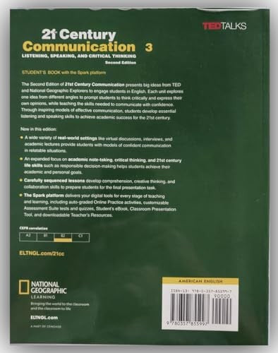 21st Century Communication, Second Edition, a four-level series, presents big ideas from TED and National Geographic Explorers to engage students in English. Each unit explores one idea from different angles to prompt students to think critically and express their own opinions, while teaching the skills needed to communicate with confidence. Through inspiring models of effective communication, students develop essential listening and speaking skills to achieve academic success for the 21st century.