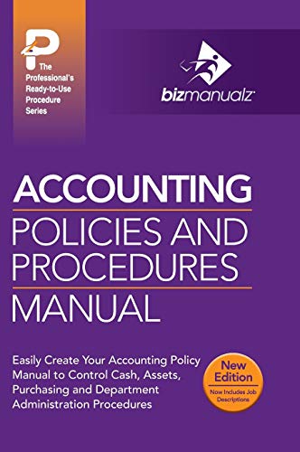 Accounting Policies and Procedures Manual - Easily create your accounting Policy Manual to Control Cash, Assets, Purchasing, and Department Administration Procedures. This Manual can help you quickly create and implement a system of accounting policies and procedures. These easily editable procedures provide the internal control needed to protect your business, as well as comply with generally accepted accounting practices and regulations like Sarbanes-Oxley. Thoroughly researched and reviewed by industry experts, these pre-written policies and procedures are based on years of experience in areas such as travel and expense, receiving, procurement, purchasing, shipping, auditing, accounts payable and receivable, and cash drawer practices. Developing policies and procedures are listed as a key control activity in the COSO publication Internal Control - Integrated Framework. The Securities and Exchange Commission (SEC) and the Public Company Accounting Oversight Board (PCAOB) both point to this COSO document as an example of internal controls that comply with Sarbanes-Oxley requirements. Designed for busy professionals like CFOs, Controllers, Accounting Managers, and Business Owners, the Accounting Policies and Procedures Manual can save you hundreds of hours in research, development, writing, and review of needed procedures for control and compliance. It will improve business performance by developing consistency and standards. It contains 39 accounting procedures that cover over 150 accounting activities, 54 supporting accounting forms and a guide to embezzlement prevention. This new edition also includes updated and complete job descriptions for every job referenced in the text. There is no need to start from scratch.it has already been done for you.| SKU | Unavailable |