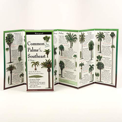 These laminated, fold-up identification guides-- FoldingGuides -- speak for themselves. Written and illustrated by local experts who know their stuff, waterproof and indestructible, they're the perfect choice for beginners and intermediates who want to know what they'll encounter in their particular locale.This guide includes 36 species of palm trees, both common and exotic, found throughout the Southeast U.S. Includes both solitary and clustering species, both cultivated and species found in the wild. Species list by Alan Meerow, palm expert and author of the authoritative Betrock's Landscape Plants. lllustrations by Robert O'Brien, well-known artist and naturalist based in Austin, Texas and Clearwater, Florida.