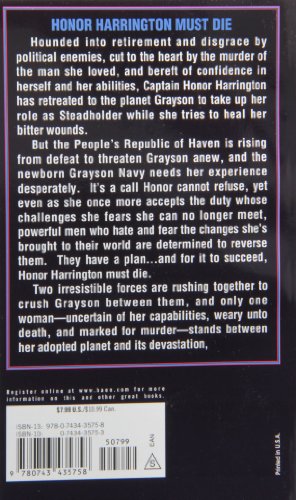 Hounded into retirement and disgrace by political enemies, cut to the heart by the murder of the man she loved, and bereft of confidence in herself and her abilities, Captain Honor Harrington has retreated to the planet Grayson to take up her role as Steadholder while she tries to heal her bitter wounds.But the People's Republic of Haven is rising from defeat to threaten Grayson anew, and the newborn Grayson Navy needs her experience desperately. It's a call Honor cannot refuse, yet even as she once more accepts the duty whose challenges she fears she can no longer meet, powerful men who hate and fear the changes she's brought to their world are determined to reverse them. They have a plan . and for it to succeed Honor Harrington must die.