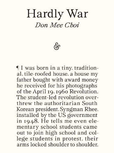 ‘Hardly War is harrowing to read, a full-bodied immersion into a stream of jagged, unharmonized voices. But it also offers comfort in its sly indictment of war’s ideological tools, the language of nationalism, militarism, patriotism, and the binaries of the Cold War. Perhaps the swaying hydrangeas and the declassified flowers of Choi’s cosmos may linger in our minds, propagating more disobedient vocabulary for talking about war and imagining a future beyond its ravages.’ Sukjong Hong, The Margins